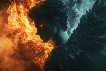 Portrait of a man with angel wings and fire in the background