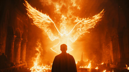 Silhouette of a man in front of the Holy dove engulfed in fire