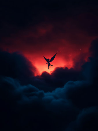 A mysterious winged figure ascends gracefully through striking red and dark clouds during twilight, creating an enchanting and ethereal atmosphere in the sky.
