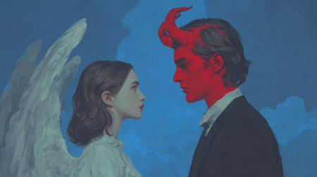 An angel and a demon in the body of a man and a woman, good and evil, good and bad. The concept of goodness and evil in one person, Husband and wife are finger and thumb. One bone, one flesh. High quality