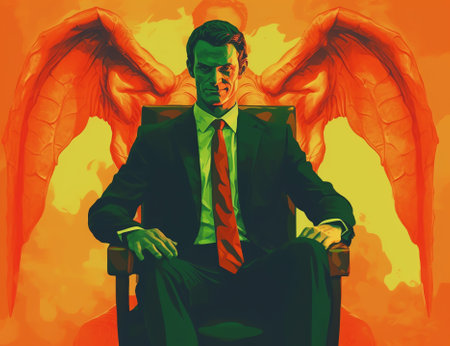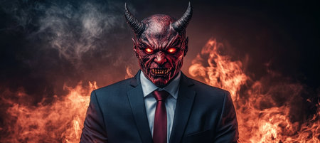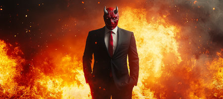 Devil in Business Suit, Red Mask with Horns, Fiery Background, Dramatic Lighting, Intense Colors