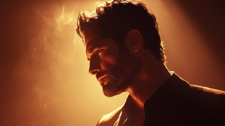 A dramatic portrait of a man, silhouetted against a golden haze. The lighting and mood create a sense of mystery.