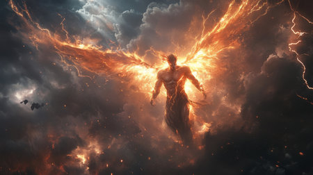 A digital painting depicting a powerful angel with fiery wings soaring through a dramatic stormy sky. The image evokes feelings of power and wonder.