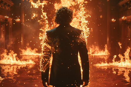 A furious man dressed in a suit takes a selfie while engulfed in fire, reflecting intense emotion amid the chaotic backdrop.