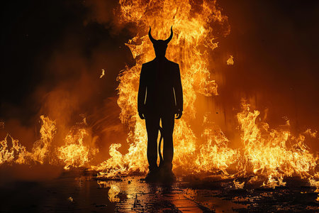 Silhouette of a demon in front of a big fire.