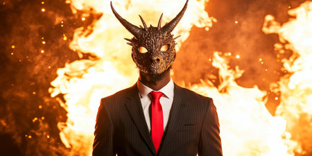 Confident Businessman in Devil Mask with Horns against Fiery Backdrop, Business and Power Concept