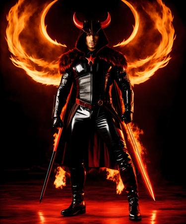Full length portrait of a demon warrior with a sword in his hands.