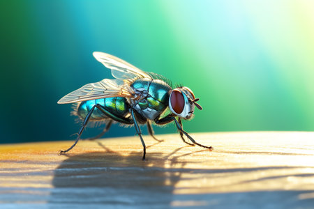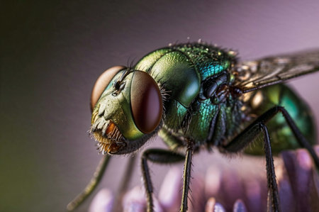 Macro close-up of a fly showing wings, fine hairs and iridescent shimmer on a blurred background. Generative AI.