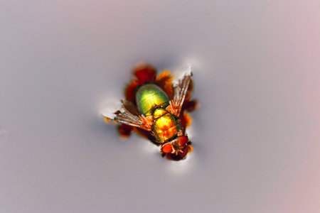 Macro closeup of a vibrant green bottle fly perched on a reflective bubble showcasing stunning iridescent colors and intricate details against a dark background