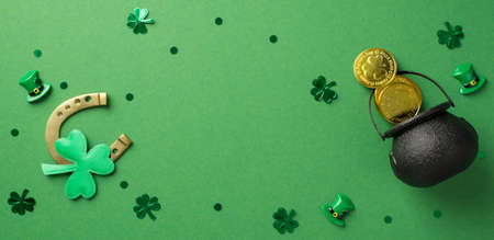 Top view photo of the bronze horseshoe and a lot of confetti in shape of clovers dots hats and black pot with coins on the green isolated background blank space