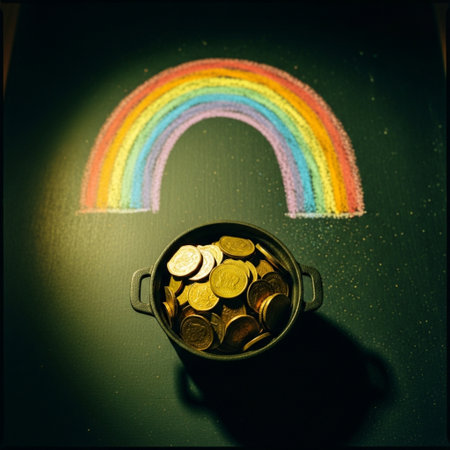 Coins in a pot with a rainbow on the chalkboard.