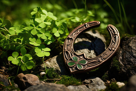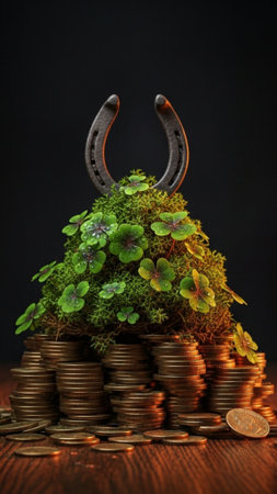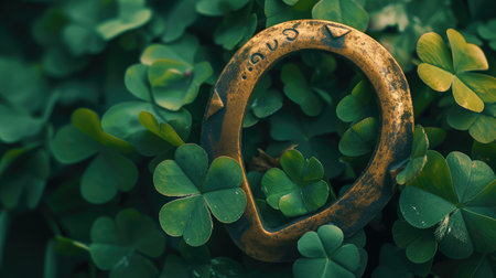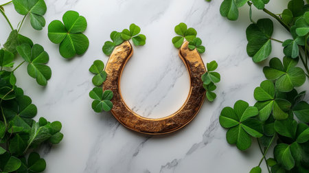 Rustic gold horseshoe rests on dark wood surrounded by shamrocks. St. Patrick's Day concept.