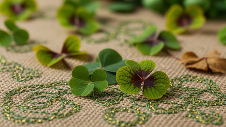 Lucky clovers on burlap with ornate stitching. St. Patrick's Day.