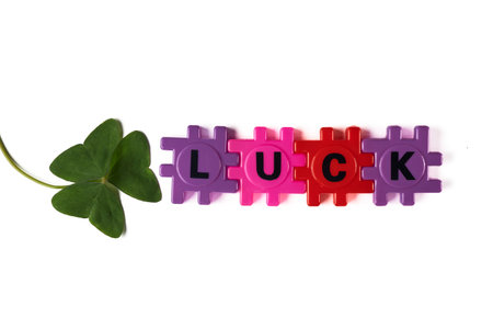 Vibrant, interlocking puzzle pieces spell LUCK, accompanied by a fresh four-leaf clover. This cheerful composition evokes luck, celebration, and positive vibes suitable for St. Patrick's Day, gifts, and decorative projects.