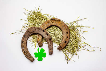 Cast iron metal horseshoes on hay, isolated on white background. Felt clover leaf, Good luck symbol, St.Patrick's Day concept, horse accessories
