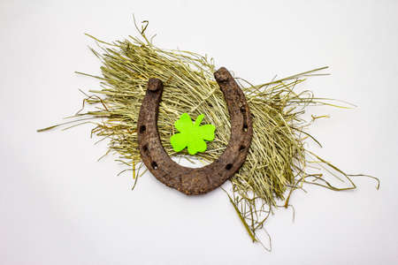Cast iron metal horseshoe on hay, isolated on white background. Felt clover leaf, Good luck symbol, St.Patrick's Day concept, horse accessories