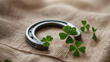 AI Generated. Horseshoe and clovers on burlap background for luck