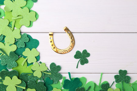 Decorative clover leaves and horseshoe on wooden background, flat lay. St. Patrick's Day celebration