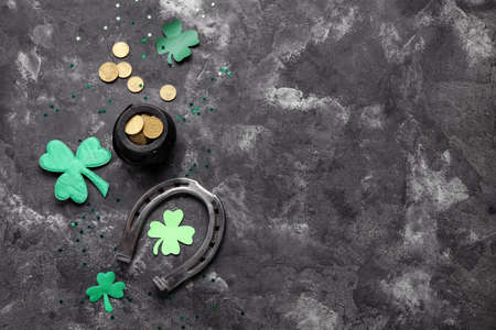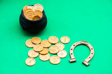 Leprechaun pot with golden coins and horseshoe on dark background. St. Patrick's Day celebration