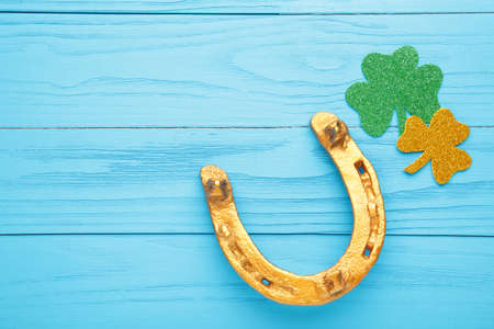 Green clovers and gold horseshoe on blue wooden background for St. Patrick's Day Holiday. Top view.