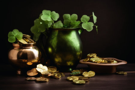 Clover leaves and gold coins on dark background. St.Patrick's Day