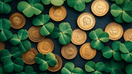 Golden coins are placed thoughtfully among vibrant green clover leaves on a dark textured surface, creating a festive atmosphere, ideal for St. Patrick's Day or similar celebrations.