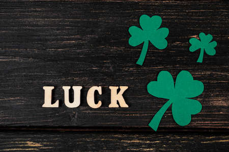Word luck and shamrock clover leaves on white wooden background. Happy St. Patrick's Day. Irish holiday.