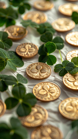 Minimalistic stpatrick's day photoreportage close up of shamrocks and gold coins on white