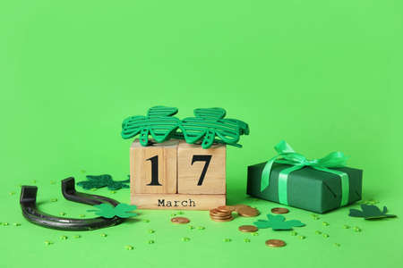 Gift box, calendar, glasses and horseshoe on green background. St. Patrick's Day celebration