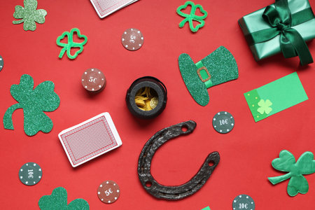 Composition with poker chips, cards and decorations for St. Patrick's Day celebration on red background