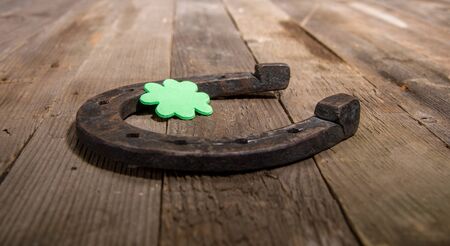 Very old cast iron metal horse horseshoe, fresh clover leaf. Good luck symbol, St.Patrick's Day concept. Antique wooden background, horse accessories