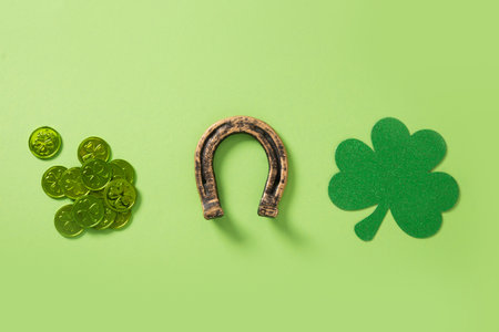 Flat lay composition with horseshoe on green background. St. Patrick's Day celebration