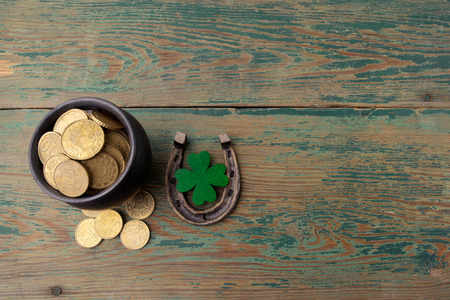 St. Patrick's Day background with coins, cauldron and horseshoe
