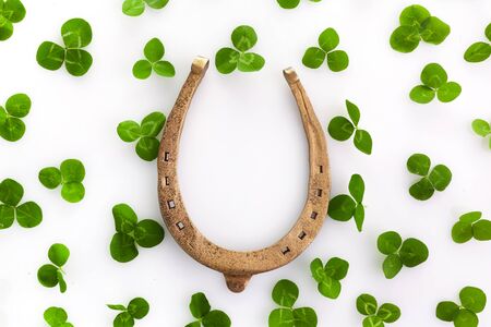 Success symbol. Holiday concept. Horseshoe with clovers leaves isolated on white background. Greeting card.