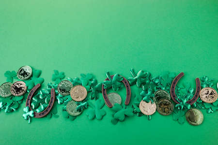 St. Patrick's Day celebration Concept. Greeting card with traditional symbols - Golden horseshoe, gold coins and clover leaves, green shamrocks on green background. Top view, copy space.