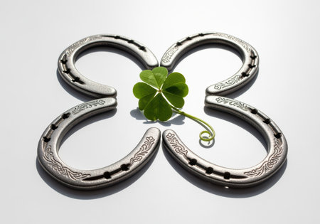 Lucky four leaf clover with decorative horseshoes arranged in a clover shape symbolizing luck and good fortune indoors.