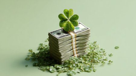 Stacks of US dollar bills bound in bands sit among ivy and a four leaf clover, symbolizing luck, wealth, and financial growth. Generated A.I.