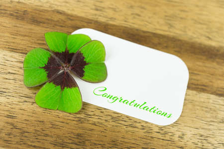 Lush green four-leaf clover on weathered wooden table closeup. Floral St Patrick holiday symbol of luck and happiness. Irish culture