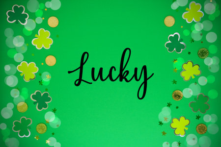 Decorative Saint Patricks Day, Green Flat Lay, English Text Lucky