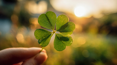 A hand gently cradles a bright four-leaf clover as warm sunlight bathes the scene, symbolizing optimism and serendipity amid a softly blurred natural setting.
