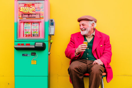 An elderly white man with a joyful smile sits casually next to a colorful vintage slot machine. He holds a small ticket and wears a vibrant outfit, surrounded by a cheerful yellow background.