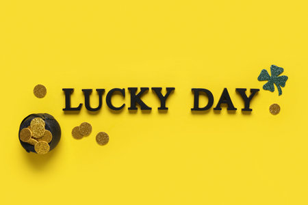 Words LUCKY DAY with clovers and pot of golden coins for St. Patrick's celebration on yellow background