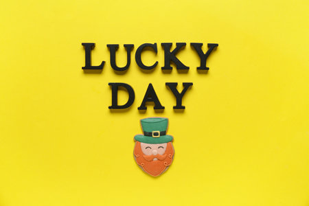 Words LUCKY DAY with gingerbread cookies for St. Patrick's celebration on yellow background