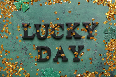 Words LUCKY DAY with clovers and sequins for St. Patrick's celebration on green grunge background