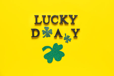 Words LUCKY DAY with clovers for St. Patrick's celebration on yellow background