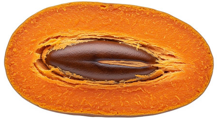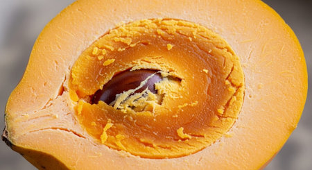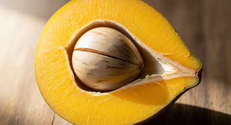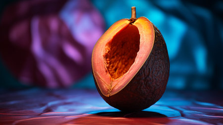 A close up 3D illustration of a lucuma fruit. revealing its vibrant orange flesh and dark purple seed. The detailed texture and realistic lighting make this image perfect for showcasing this exotic fruit.