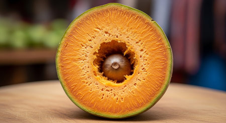 Close up of vibrant orange fruit slices arranged on a rustic wooden board, showcasing their natural seeds and texture. Perfect for healthy recipes.
