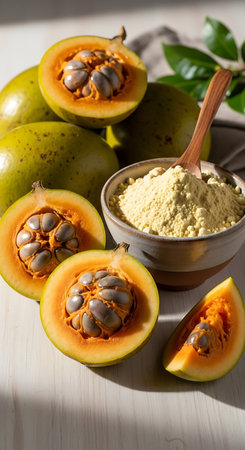 A captivating 3D illustration of a lucuma fruit. showcasing its vibrant orange flesh and dark seeds. Perfect for culinary blogs. fruit guides. and exotic food presentations.