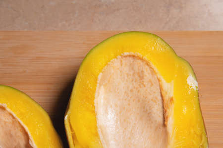 Cut a very ripe mango in half on a cutting board in your home kitchen. Yellow juicy tasty mango. Sweet tropical fruits for a vegetarian diet and healthy eating. view from above