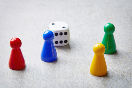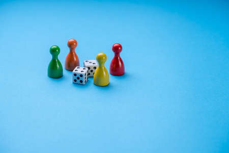 Colorful play figures with group of dice on board game